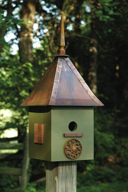 | Maximum luxury for your bluebird friends. This solid cypress house has a solid copper roof with a cast iron finial. Each model has distinctive trim and mahogany shutters. Top comes off for easy cleaning. Drainage and ventilation are included along with mounting bracket and screws. The Songbird Suite even comes with rubber feet to protect your furniture if used inside. 10″ x 10″ x 21″ – 1 1/2″ hole |