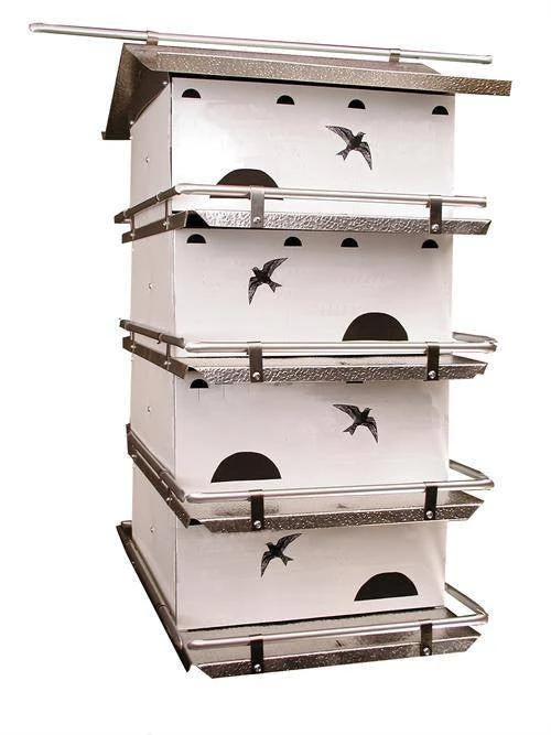 Offer your martins a wonderful place to colonize with the Waters Edge 4 Floor- 8 Room Suites from Birds Choice. One of the most scientifically proven houses available on the market today. The 6 x 12 suite concept utilizes two compartments per family offering an entry room and a nesting room. The martins enter through a starling resistant entry hole. From the entry room, they travel 90 degrees through a 2-1/4 opening into the nesting room with an elevated sub floor and nesting trays(included). This design provides greater protection from natural predators such as owls, raccoons, and hawks. Martins have a tendency to yield more fledglings from large compartments and the entry room serves as a protective staging area for the young birds prior to flight. Louvered air vents and attic insulation provide optimal protection from temperature extremes. Each suite has its own private porch with guard rail. Hinged doors allow easy access and roof perch lets the birds sit on top of their ‘mansion.’ Mansion features include all cool aluminum and stainless steel construction, reflective roof, hinged clean out doors, guard rails, top perch, and an all aluminum base plate. Assembled with rivets. Made to fit this Heavy Duty 12ft Pole.