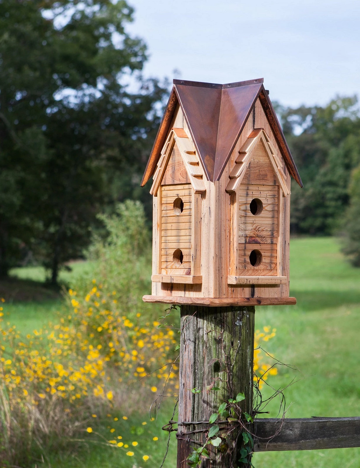 Give your birds and your yard a true touch of elegance with the Heatwood Copper Mansion Bird House. Built with solid cypress and solid copper roof this house is a true work of art. Crafted of reverse board and batten vertical siding with side modules of beveled horizontal siding with eyebrow gables. Each of the 8 compartments are functional for roosting or nesting. Each triangular compartment measures 9.5″ wide in the front, 4.75″ deep, and 6.5″ tall, to easily house a new martin family. Roof comes off for easy cleaning. Mounting bracket and screws are provided. 15″ x 15″ x 27″ – 2 1/4″ hole Weight 30 lbs. Dimensional Shipping Weight 46 lbs |
