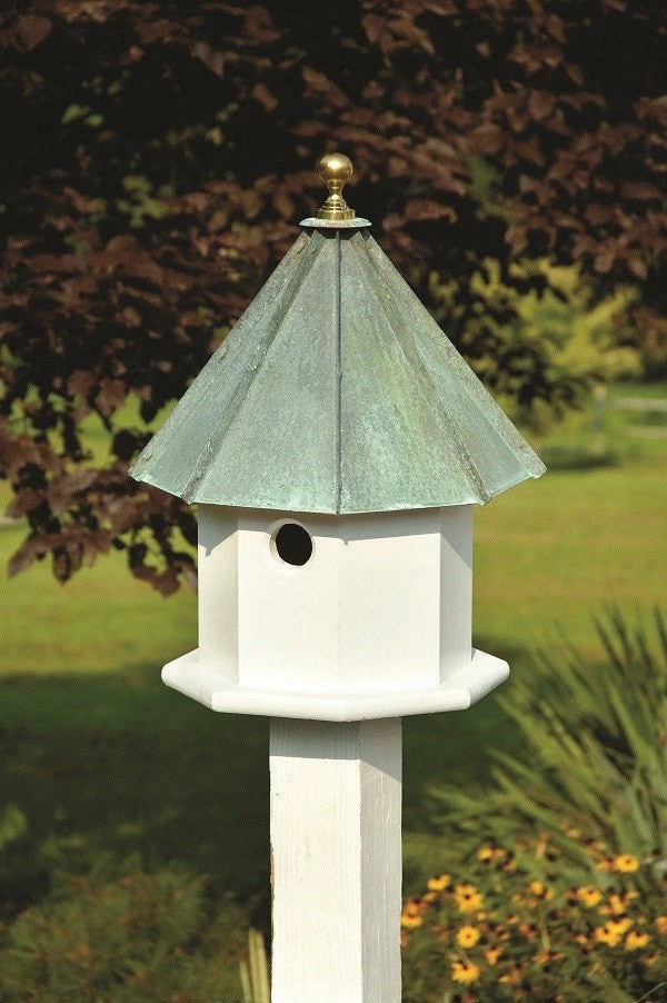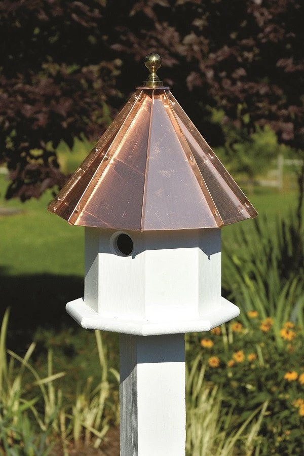 How much will you and your birds love this home? Let us count the ways: 8 sides, 2 compartments, 365 days of beauty. Bright white body topped by solid copper ridged roof and solid brass finial. Roof removes as easily as a lampshade for simple cleaning; mounting bracket and screws included for easy post mounting. New body material is Cellular PVC. It is a completely synthetic and maintenance free wood substitute. It will not absorb moisture, crack, split, warp, delaminate or rot. You have the rich appearance of wood with none of the maintenance issues related to painted wood. It maintains a like new appearance in all types of weather. Cellular PVC requires no paint for protection or appearance. It also resists wood-boring insects, freeze/thaw cycles and high humidity.
