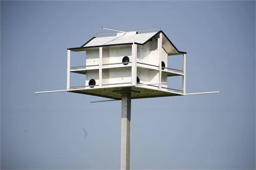 Compartments have side entrances, which the martins like because they turn right or left into large 6 x 11 suites with vinyl coated wire sub-floors, removable fronts and ventilation that you can open and close to keep the birds comfortable. Two 48″ smooth fiberglass perch rods will add an abundance of perch space to the bottom porch. This spacious house has wide rain guard porches to keep the nest dry in extreme weather conditions. Porch dividers increase occupancy and decrease porch dominance.